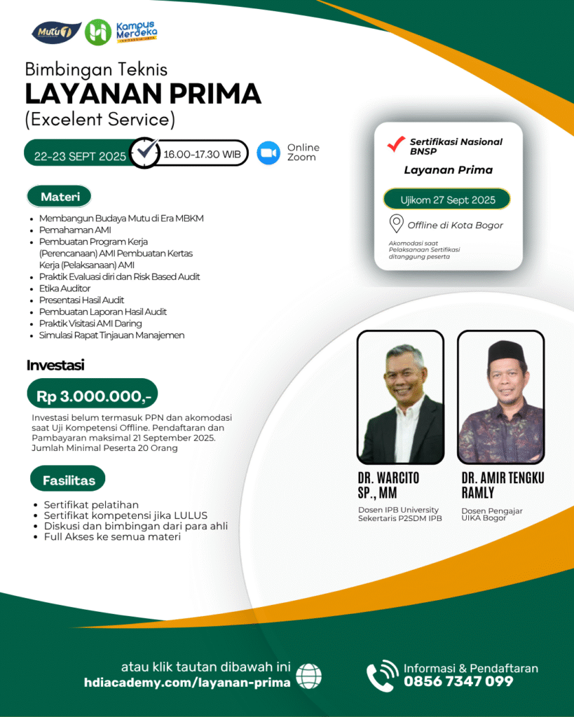 Bimtek dan Sertifikasi Pelayanan Prima adalah program pelatihan yang bertujuan untuk meningkatkan kualitas pelayanan dalam berbagai sektor, baik itu di bidang bisnis, pemerintahan, maupun organisasi lainnya. Pelatihan ini memberikan pengetahuan dan keterampilan kepada peserta dalam memberikan layanan yang berkualitas tinggi dan sesuai dengan harapan pelanggan atau masyarakat. Sertifikasi ini memberikan pengakuan bahwa individu atau organisasi memiliki kompetensi dalam memberikan pelayanan prima yang dapat meningkatkan kepuasan pelanggan dan membangun hubungan jangka panjang. Bimtek (Bimbingan Teknis) Pelayanan Prima adalah pelatihan yang berfokus pada pengembangan keterampilan dan pengetahuan peserta dalam memberikan pelayanan yang unggul dan berorientasi pada kepuasan pelanggan. Program ini biasanya mencakup berbagai konsep, teknik, dan metode yang dapat digunakan untuk meningkatkan kualitas pelayanan di berbagai jenis organisasi, baik di sektor publik maupun swasta